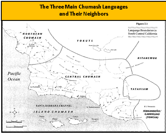 Map Source: Kathryn Klar, Kenneth Whistler, and Sally McLendon, “Chapter 2: The Chumash Languages: An Overview,” In Sally McLendon and John R. Johnson, Cultural Affiliation and Lineal Descent of Chumash Peoples in the Channel Islands and the Santa Monica Mountains, Volume 1 (Santa Barbara Museum of Natural History, 1999), p. 23.